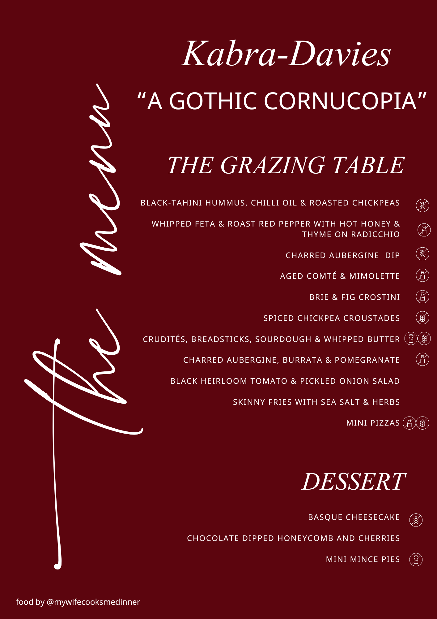 The creative direction was inspired by the Addams Family - gothic, dark, and romantic. The menu needed to be entirely vegetarian, designed around ideas of abundance, generosity, and love, and suitable for a relaxed, standing format.